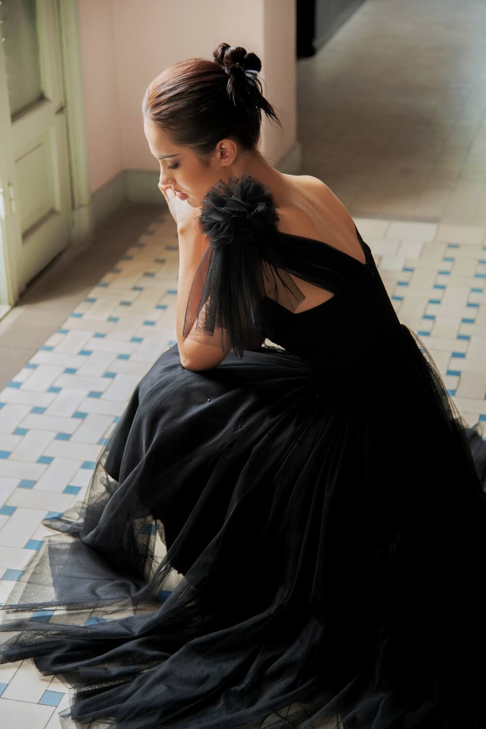 Gorgeous like a midnight sky with a classic black background which is made of thin and light mesh fabric adorned with sparkling stone - symbolized for shining stars. A 3D floral pattern is designed delicately on a sexy off-shoulder to create a graceful and elegant look for the wearer.