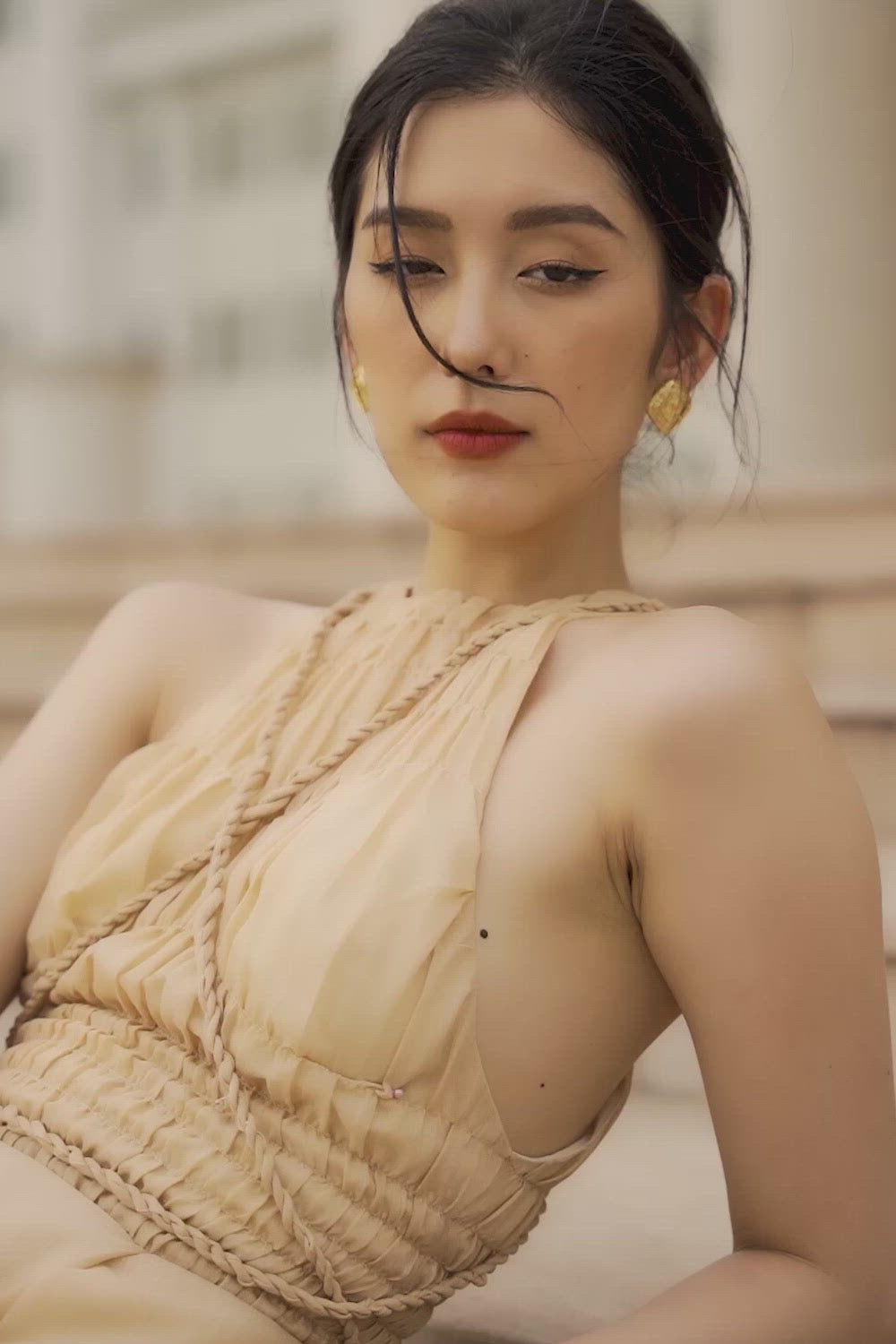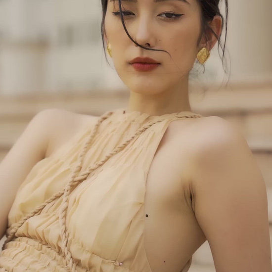 Made with unique string detail, the dress brings out the sinewiness but not less the charm, a delicate side slit cut also enhances the beauty of the wearer's lower body.