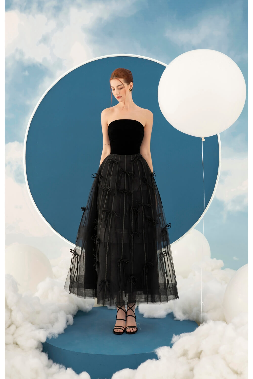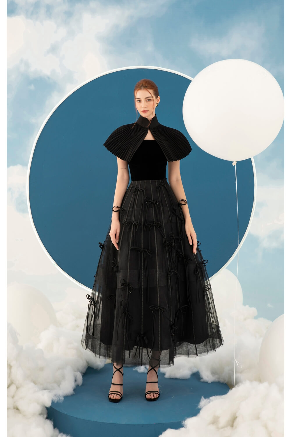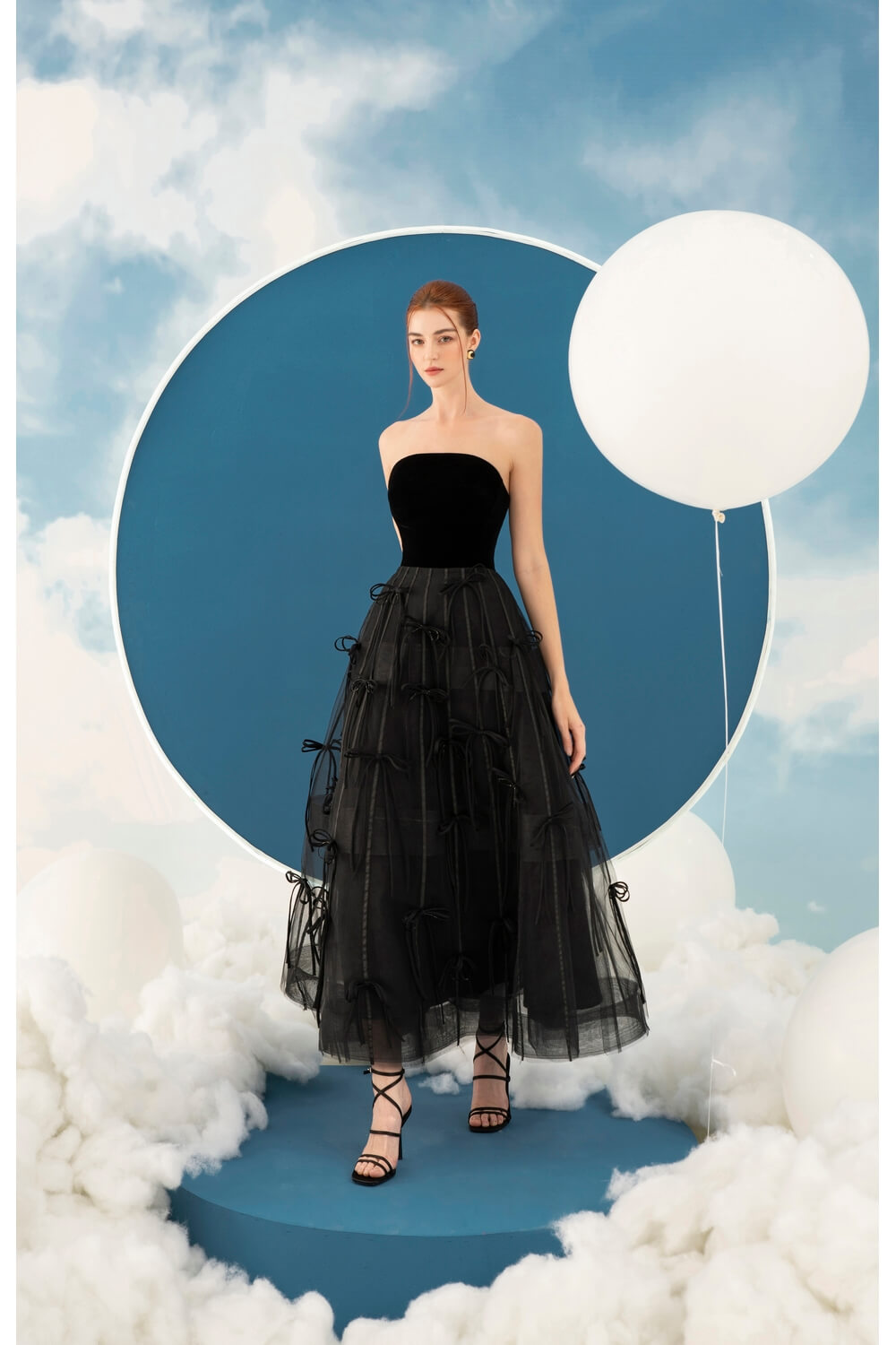 The dress proves its charm when transforming impressively on a classic black background. Especially is the skirt design with bowtie details which are attached delicately on a see-through mesh making the dress both elegant and mysterious.