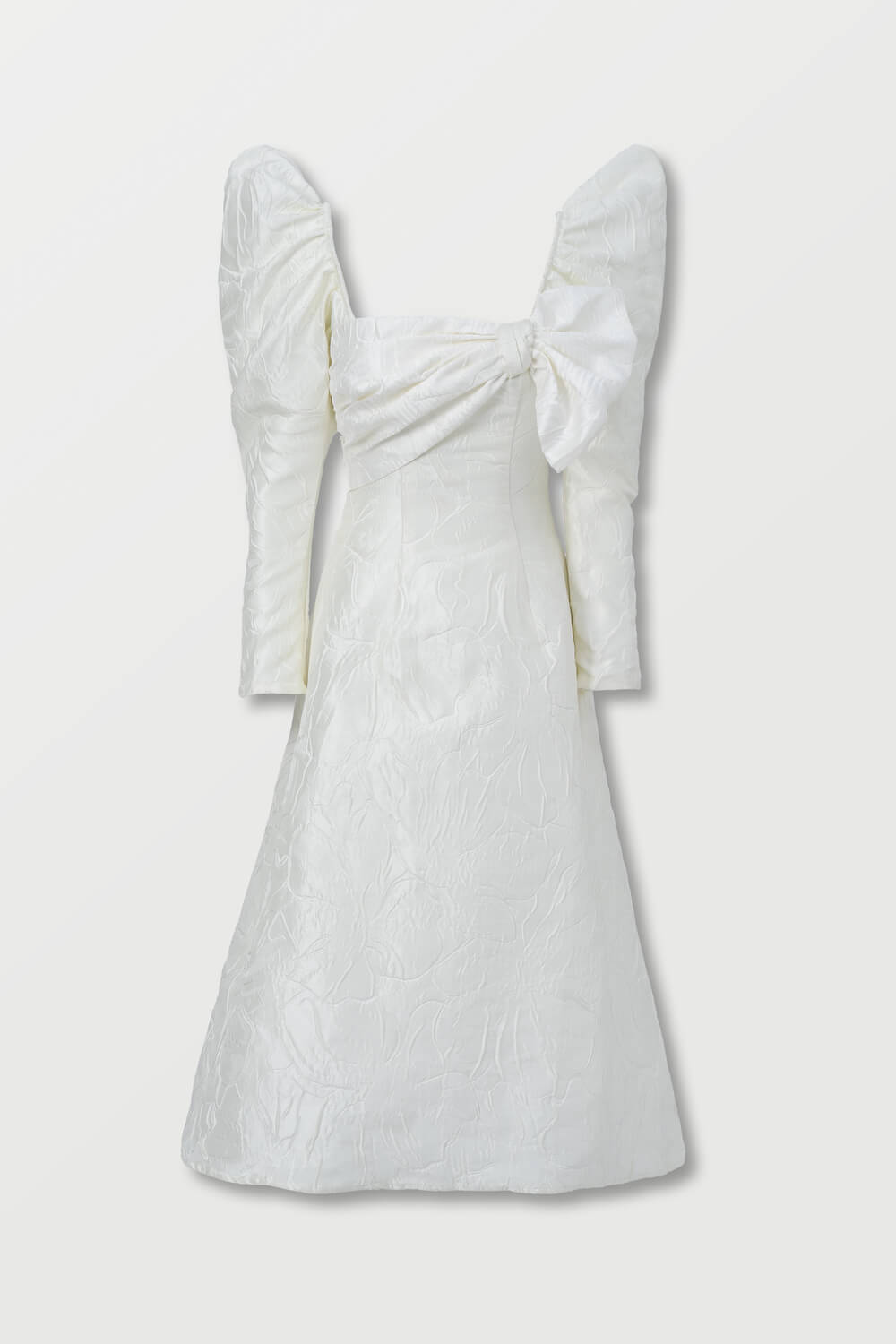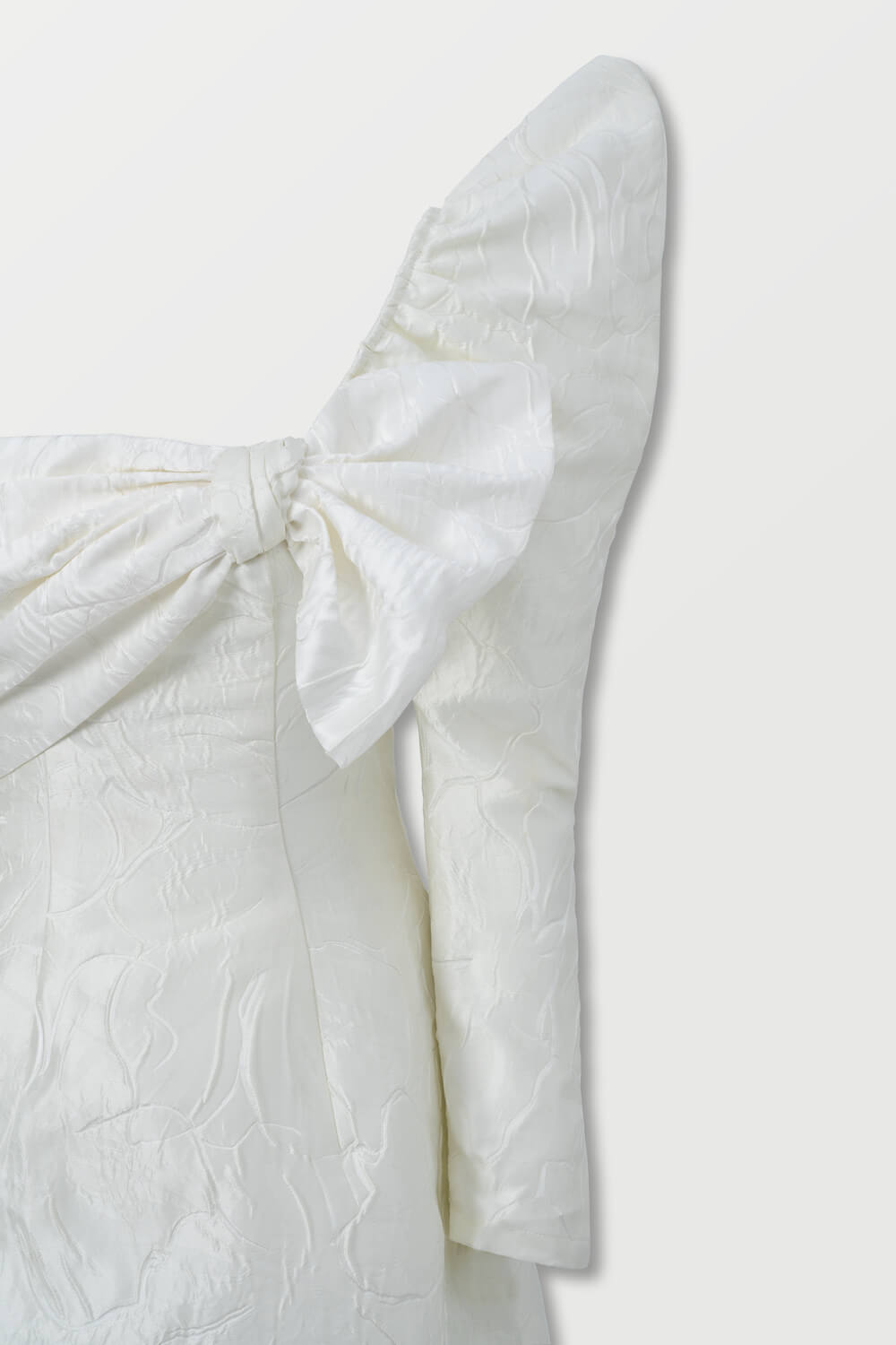 Elegant puffy shoulders add charm to this classy composition. Supple folds cross over the bust in a graceful bow twist formation, adding a dash of stand-out to your next event or nighttime adventure.
