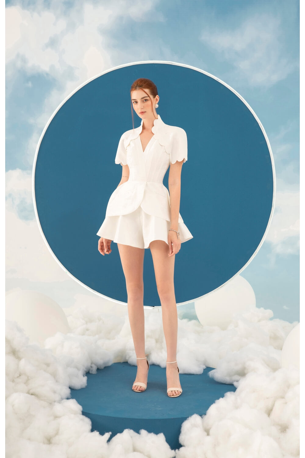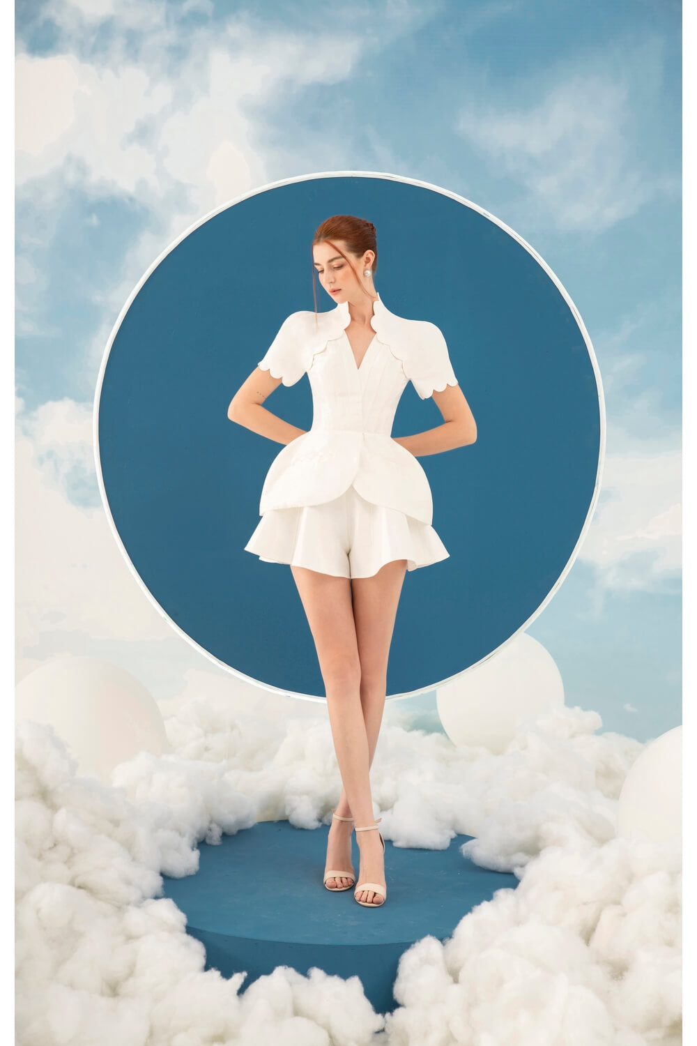 Soft like a big white cloud, the set with wavy sleeves shirt and comfortable shorts will soften your day. The winding design of the wide legs shorts combined with a peplum form of the shirt contributes to flatter the wearer's hip and created a poetic overall.